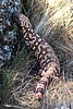 Description: A large stout-bodied lizard with a big head, rounded body and tail, short muscular legs with big feet and large toes and strong claws. It is a beaded lizard, with a bead-like skin on its upper surfaces. The snout is solid black and they have an overall reticulated color pattern that is pink and black, orange and black, or yellowish and black. The rounded tail is fairly short and sausage shaped and has five black bands. They also have a black tongue. The species is our largest lizard with the maximum total length reaching 22 in (56.0 cm). For this subspecies the adults have dark broad cross bands with light colored (pink, orange, yellow) circles inside. Hatchlings average 6.5 in (16.5 cm) and weigh 1.2 oz (32.7g). Comments: They are not aggressive or dangerous unless they are picked up and handled. Then, they may grab an arm or a finger, cling with a vise-like grip and implant their venom by chewing it in. The venom glands are located beneath the skin in the lower jaw. The glands have ducts that carry venom to the edge of grooved venom-conducting teeth. Their heavy, stubby tail stores fat and provides subsistence when food is short. The Gila Monster is diurnal during the Spring Months and Nocturnal during the Hotter Summer Months. It is most active from March to June. Although they are diurnal they spend most of their time underground. They will only spend on average 3 Weeks a Year above Ground. They are strong climbers as well as powerful diggers. They have good daylight vision and excellent hearing. The species is sedentary and long-lived denning reptiles that return year after year to the same cold-season home site. Gila monsters are believed to live from 10-25 years. Coyotes, owls, hawks, and eagles may prey upon them and other reptiles probably consume immatures as well. The Gila Monster is a Carnivore and stores most of it's Fat in it's Tail. Due to it's slow Metabolism, it may only eat 4 to 5 times a Year.... Special Notes: Gila Monsters are Protected in the State of Arizona...They are on the Official Restricted Wildlife List...Although they are Prey for many other Carnivores, their biggest Threat and Decline is due to Humans and Encroaching Human Development, resulting in the Loss of Habitat. They are sensitive Reptiles and react very poorly to Stress caused by Human Interaction and Encroachment. This Stress can carry serious Physical consequences for them. When they are displaced due to Human Contact or Encroachment, they must be placed in Captivity due to High Mortality Rates caused by Relocation...A Majority do not survive the transition into Captivity either. They simply do not adapt well to Change or Stress likely due to their unique Physical and Behavioral Factors. Most Gila Monsters that are on the Market for Sale elsewhere were born in Captivity. It is against the Law in the State of Arizona to harass, harm, pursue, hunt, shoot, wound, kill, capture, trap, or collect Gila Monsters or to attempt such acts. Fines can be as much as $8000.00 per Violation. Source: Arizona Game & Fish Dept. Source: Reptiles and Amphibians of AZ Source: Arizona Revised Statutes Source: Arizona Administrative Codes Source: University of Arizona Cooperative Extension Source: Phoenix Herpetological Society |