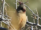 Habitat: arid brush, thorn scrub & mesquite. Description: Males are Overall gray with a bright red-tipped crest, red mask, throat, breast, belly and edges of wings and tail. Stout yellow bill. Dark eyes. Females are similar but lacking red on face, throat, breast & belly. Female bill is gray to dull yellow. Juveniles are similar to female with a dark gray bill. Comments: In the same genus as the Cardinal with a similar loud crisp song and single metallic "chip" call. Female Northern Cardinal is buff brown with a red bill. All info sourced from Birds of Arizona Field Guide by Stan Tekiela. |