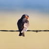 Habitat:Open areas around buildings and Cliffs. Found throughout the U.S. in Summer, but Winters in South America. Description:Sparrow sized with dull Steel Blue above, Buff White below. Pale Buff Rump with Squared Tail. Throat is dark Chestnut, with White Forehead. Southwestern birds may have a Chestnut Forehead. Comments:Cave Swallow is similar, but is smaller with Buff colored Throat and darker Rump. The Introduction of the House Sparrow has led to the decline of the Cliff Swallow, as Sparrows invade the nests, forcing the Swallows to abandon entire colonies. Source: Audubon Online Guides |