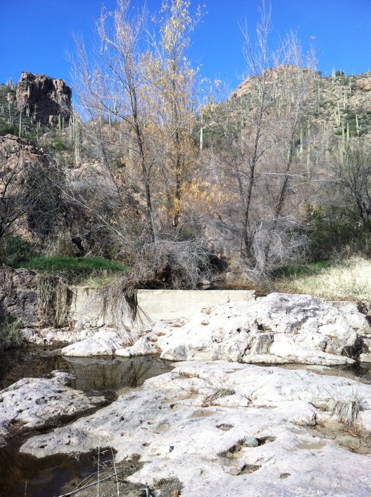 View of "mini-dam" from front. I wonder how long water lasts here? Dam was holding back pretty good amount of water trapped in bedrock behind, and some large trees in area providing shade to pool, might last long into dry times?