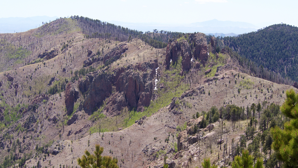 A lot of burn, but snow remains in the chutes of Paint Rock. Raspberry left and Monte Vista on the far right.
