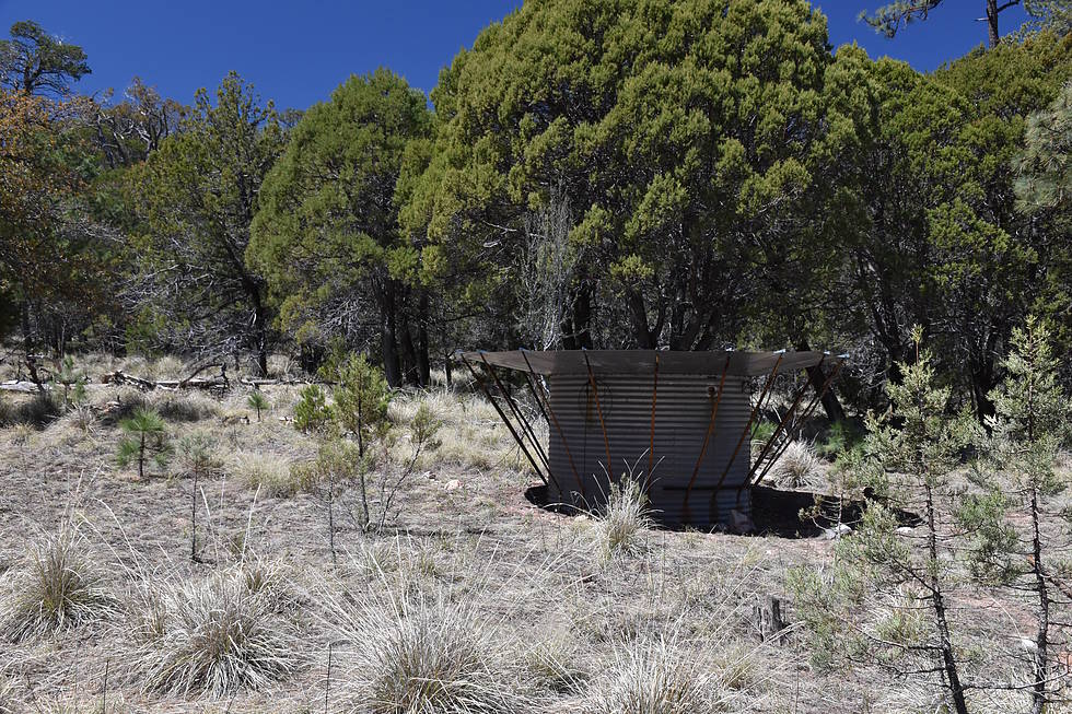 Back on the Huachuca Peak Trail at Pine Park. Tank for collecting water. There is a trough just off photo to the right for wildlife. This portion of the trail east of the Crest Trail is on the Fort Huachuca Base. No special pass is required on this trail. Passes are required for other trails that start on the base.
